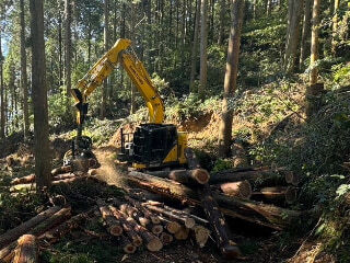 チェンソー伐採、木材の搬出、作業路作設、プロセッサー造材等、高性能林業機械を用いての作業