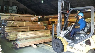 ■プレカット加工材の出荷の為の荷揃え、及び積み込み作業。積み込み作業は一部手作業もあり。